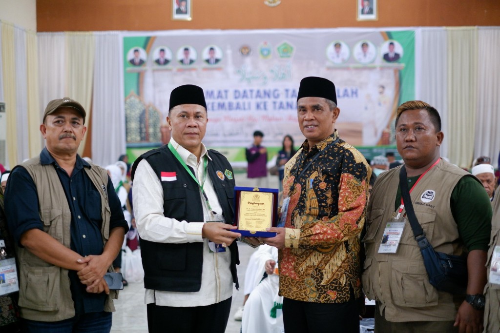 Penghargaan diserahkan Ketua PPIH Debarkasi Medan juga Kakanwil Kemenag Sumut H Ahmad Qosbi Nasution, SAg, MA kepada Kakan Kemenag Kota Medan Dr H Impun Siregar, MA saat kepulangan 100 jamaah haji Kloter 24 yang merupakan Kloter terakhir Debarkasi Medan di Asrama Haji Medan, Rabu (9/7/2025) malam.