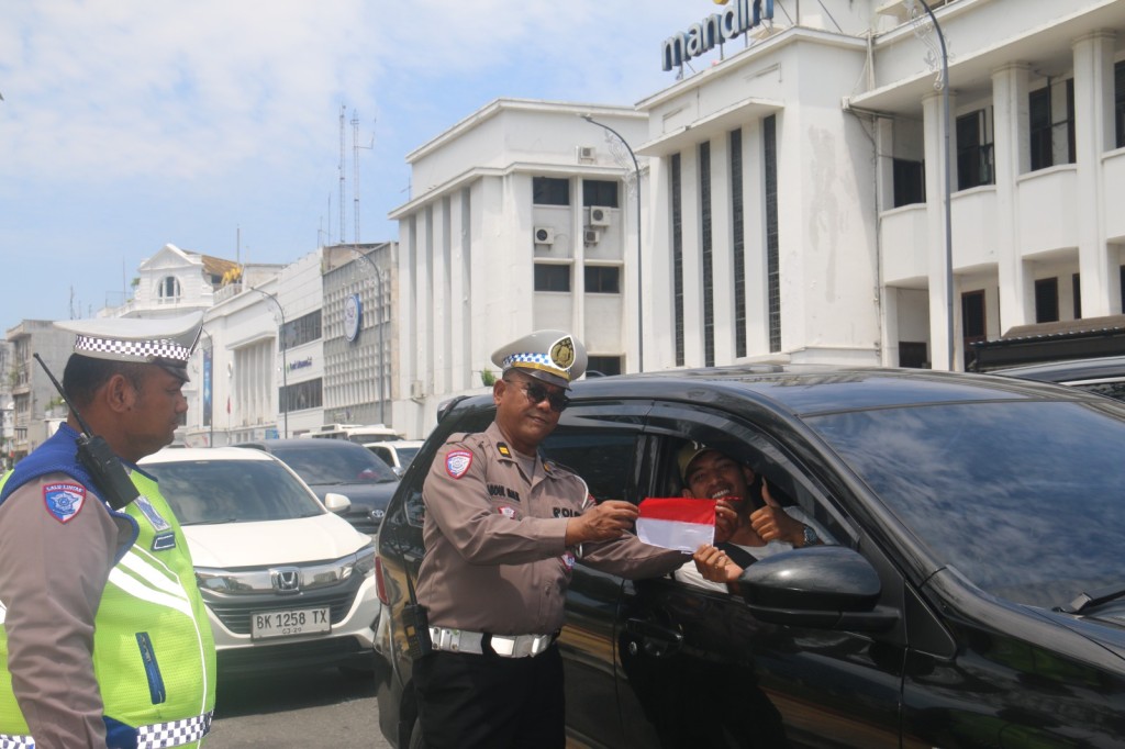 Sejumlah anggota Polantas Polrestabes Medan di wilayah hukum Polda Sumatera Utara aktif membagikan bendera Merah Putih ke sejumlah pengendara. Sambil tersenyum ramah, para anggota memberikan bendera dan langsung memasangnya di truk, mobil, dan motor milik warga yang sedang melewati jalan.