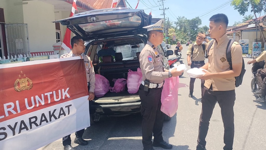 Jurnaltransparansi|Labuhanbatu – Satlantas Polres Labuhanbatu membagikan ratusan nasi kotak kepada para tukang becak, tukang parkir, warga dan pengendara bermotor, serta kegiatan ini dalam rangka Jumat berkah di sekitar kota Rantau Prapat.